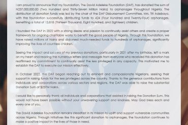 David Adeleke made this announcement on his official Twitter handle: “I’ve always wanted to use my platform to serve others....