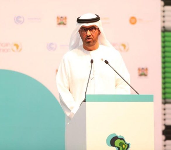 COP28 President Sultan Al Jaber delivers his remarks during the Africa Climate Summit 2023 at the Kenyatta International Convention Centre...