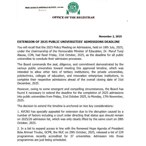November 3, 2025By Ayinde Adeleke The Joint Admissions and Matriculation Board (JAMB) has extended the deadline for the completion of...