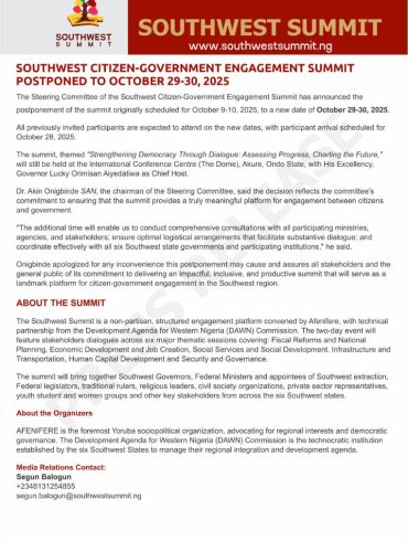 October 5, 2025By Tobi Akinnubi The organisers of the Southwest Citizen-Government Engagement Summit have announced new dates for the event,...