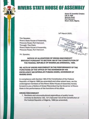 March 17, 2025 By Ayinde Adeleke The Rivers State House of Assembly has initiated impeachment proceedings against Governor Siminalayi Fubara...