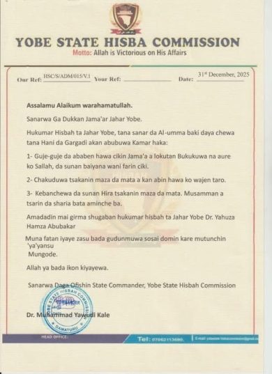 The notice was issued by the office of the State Commander of the Hisbah Commission, Dr. Muhammad Yawudi Kale, and approved by the Chairman of the Yobe State Hisbah Commission, Dr. Yahuza Hamza Abubakar.